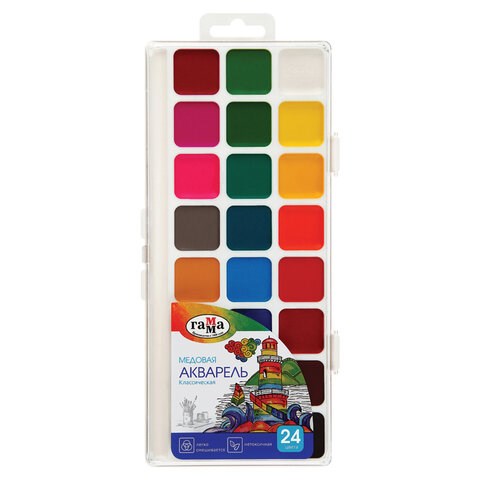 Краски акварельные ГАММА "Классическая", 24 цвета, медовые, пластиковый корпус, европодвес, 1009198