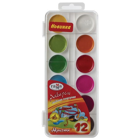 Краски акварельные ГАММА "Мультики NEW", 12 цветов, медовая, пластиковый корпус, европодвес, 211046_12