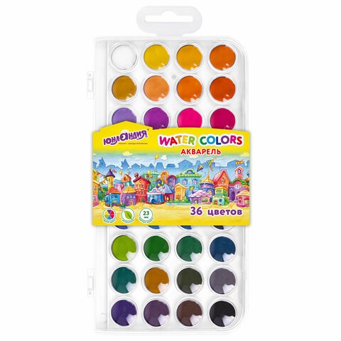 Краски акварельные ЮНЛАНДИЯ "ДОМИКИ", 36 цветов, круглые кюветы 23 мм, пенал, 192633