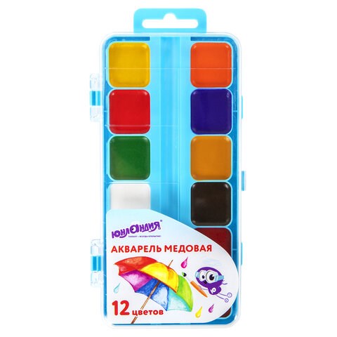 12 ярких насыщенных цветов отлично смешиваются между собой и позволяют создать множество оттенков, обеспечивают однородное окрашивание. Краски быстро высыхают и не портятся со временем. Безопасны для детей, нетоксичны. Выпускаются в пластиковом пенале с прозрачной крышкой, квадратной формой кювет и отделением для кисточки. Упаковка обладает компактными размерами и легким весом.