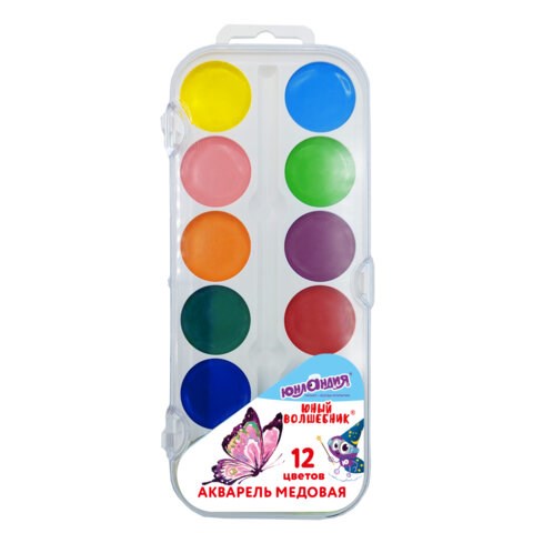 Краски акварельные ЮНЛАНДИЯ "ЮНЫЙ ВОЛШЕБНИК", медовые, 12 цветов, круглые кюветы, пластик, 192358