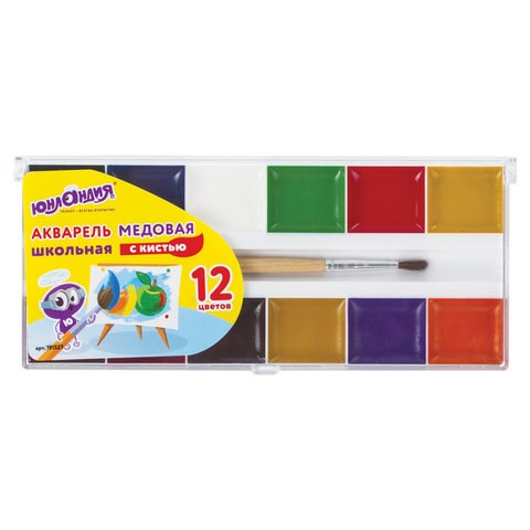 Краски акварельные ЮНЛАНДИЯ "ШКОЛЬНЫЕ", 12 цветов, медовые, увеличенный объем кювет, С КИСТЬЮ, пластиковая коробка, 191527