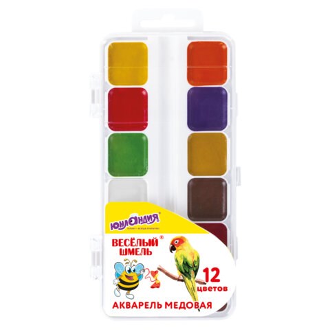 Краски акварельные ЮНЛАНДИЯ "ВЕСЁЛЫЙ ШМЕЛЬ", медовые, 12 цветов, квадратные кюветы, пластик, 192362