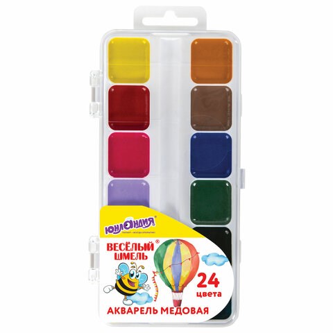 Краски акварельные ЮНЛАНДИЯ "ВЕСЁЛЫЙ ШМЕЛЬ", медовые, 24 цвета, квадратные кюветы, пластик, 192363