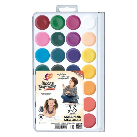 Краски акварельные ЛУЧ "Школа творчества", 28 цветов, медовые, без кисти, пластиковая коробка, 29С 1759-08