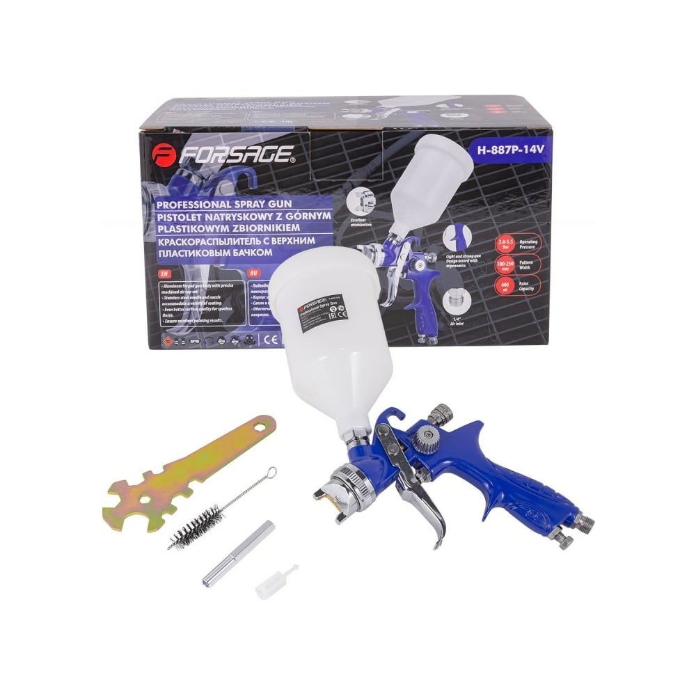Краскопульт с верхним пластиковым бачком от бренда Forsage предназначен для нанесения всех видов лакокрасочных материалов, обеспечивая отличный результат покраски.Основные характеристики:Материал корпуса: Сплав нержавеющей сталиДиаметр сопла: 1,4 ммРабочее давление: 2,0-3,5 барШирина распыления: 180-250 ммРасход воздуха: 120-200 л/минОбъем бачка: 600 млРегулировка распыления: Желаемую форму распыления и объем выпускаемой жидкости можно легко настроить с помощью ручки настройки распыления, ручки регулировки жидкости и ручки регулировки воздуха.Комплектация: В комплект входят фильтр, 2 ключа и щетка для удобства в использовании и обслуживании.Краскопульт от Forsage — это надежный инструмент для качественной покраски, который обеспечивает гибкость в настройках и простоту в эксплуатации, идеально подходящий как для профессиональных, так и для домашних задач.