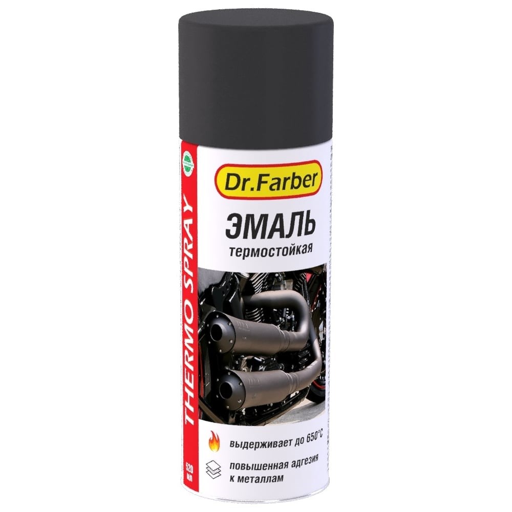 MAV Эмаль-аэрозоль Dr.Farber кремнийорганическая термостойкая до 650 С, черная 520 мл 267214 предназначена для окрашивания металлических (стальных, чугунных) поверхностей, подвергающихся воздействию высоких температур (до 650 °С): составные части выхлопной системы автомобилей, элементы трубопроводов и паропроводов, детали водонагревательного, котельного и прочего оборудования, камины, барбекю, радиаторы отопления. Свойства: Легко наносится в труднодоступные места; Имеет хорошую адгезию к металлическим поверхностям (сталь, чугун); Быстро сохнет; Образует термостойкое покрытие. Не рекомендуется наносить на горячие поверхности. Температура окрашиваемой поверхности должна быть на 5 °С выше точки росы, t баллона – не ниже 10 °С и не выше 40 °С. Применение: Подготовка поверхности: термостойкость зависит от степени подготовки поверхности. Для достижения термостойкости 400-450 °С требуется очень тщательная ручная или механическая очистка металла до появления металлического блеска (степень очистки – St3 по СТБ ISO 8501-1), затем обработка абразивными материалами (шлифовальная шкурка Р60, Р80) для придания шероховатости, после чего обезжиривание растворителем (марки 646, 647, Р-12, ацетон, ксилол, бутилацетат). Нанесение: перед нанесением баллон встряхнуть в течение 2-3 мин после появления стука шариков, а также периодически встряхивать во время использования. Время высыхания покрытия при температуре (18-22) °С и относительной влажности не более 65 % – 3-5 ч.