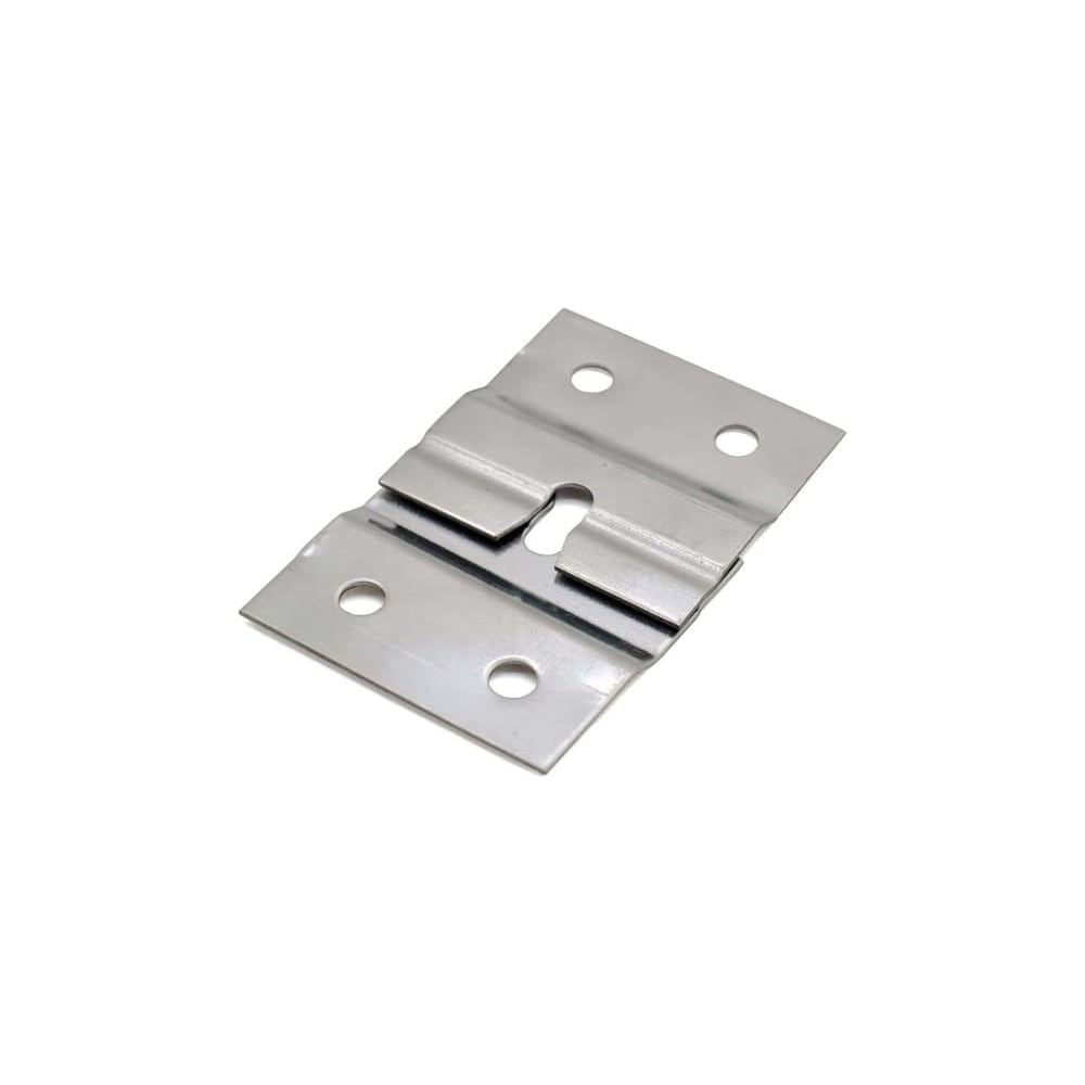 Крепеж предназначен для монтажа реечных потолков, деревянных навесных элементов шириной от 40 мм. Для соединения двух поверхностей необходимо два элемента крепежа Дуплекс. Образует технологический зазор 4 мм или без зазора при предварительной фрезеровке одной из поверхностей. Области применения: монтаж всех размеров деревянных панелей и досок толщиной от 8 мм; монтаж клееных фасадных щитов из натуральной древесины; монтаж подвесных дизайнерских реечных потолков. Дуплекс представляет собой систему скрытого металлического парного крепления, состоящую из двух одинаковых пластин: размеры пластин 40 мм х 40 мм; оснащены полками и пазовыми отверстиями для замкового сцепления; отверстия выполнены с зенковкой; полки каждого крепежа оснащены пуклевкой в виде выпуклого валика, который и обеспечивает замковое сцепление двух деталей крепежа.