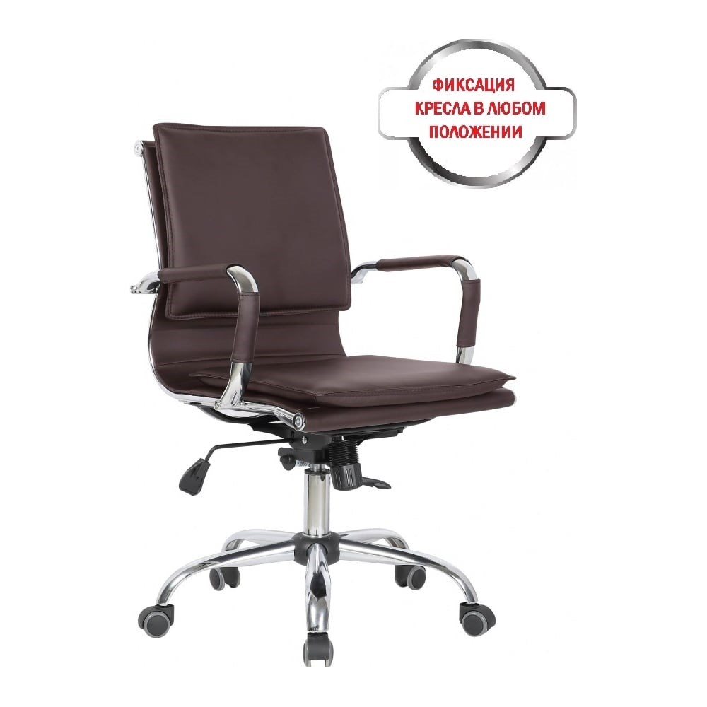 Механизм качания с регулировкой под вес и фиксацией в любом положении. Регулировка высоты (газлифт). Крестовина металлическая хромированная 64 см. Подлокотники хромированные с накладками. Материал обивки: экокожа. Цвет: Коричневый. Ограничение по весу: 120 кг. Колеса прорезиненные, подходят для твердых поверхностей.