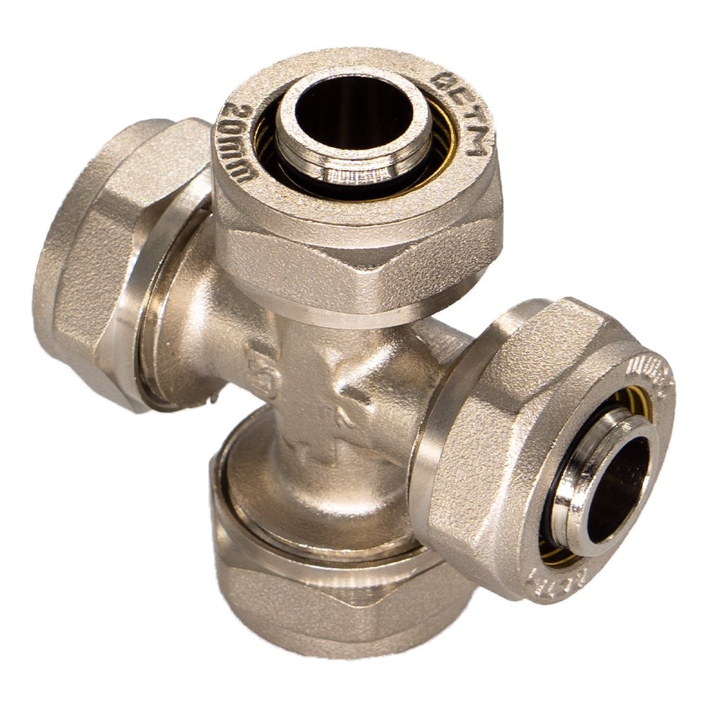 Крестовина 20х20х20х20 CTM равнопроходной обжимной фитинг для соединения металлопластиковых (металлополимерных) труб. Использование равнопроходной крестовины снижает давление потока в узле соединения при подключении дополнительных потребителей. Изготовлена методом горячей штамповки из латуни с последующей термической обработкой и никелированием для предотвращения появления коррозии, механического износа и вредного воздействия агрессивных жидкостей и воздушно-газовых сред. Корпус, накидная гайка и обжимное кольцо крестовины изготовлены из латуни, уплотнительное кольцо из нетоксичной резины (EPDM), и диэлектрическая прокладка из фторопласта Ф4 Накидная гайка – усиленная. Материал: латунь с никелированным покрытием Соединение: цанга/цанга/цанга/цанга Давление: 16 бар Рабочая температура: от -20°С до +115°С