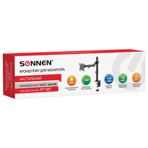 Кронштейн для монитора SONNEN STATIC оснащен креплением международного стандарта VESA, которое надежно удержит монитор диаметром 17 - 32". Поворотно-наклонная конструкция кронштейна позволяет вращать экран на 360°, наклонять на 45° вверх и вниз, поворачивать на 90° вправо и влево, а также регулировать высоту крепления. Все это поможет Вам подобрать оптимальный угол обзора для решения задач различной направленности, сохранит правильную осанку и хорошее зрение. Конструкция кронштейна выдерживает нагрузку до 8 кг, что позволяет использовать его для крепления не только мониторов, но и телевизоров. Изделие крепится с помощью струбцины к краю столешницы любой толщины, не повреждая покрытие. А наличие кабель-канала поможет решить проблему "лишних" проводов. Все это позволит вам освободить дополнительное место на столе и создаст наиболее комфортные условия для работы и отдыха. Кронштейн изготовлен из высококачественной стали, что делает его невероятно износостойким и значительно продлевает срок его службы. А черный цвет изделия делает его стильным и позволяет вписаться в любой интерьер. В комплект поставки кронштейна SONNEN STATIC входят все необходимые материалы для монтажа.