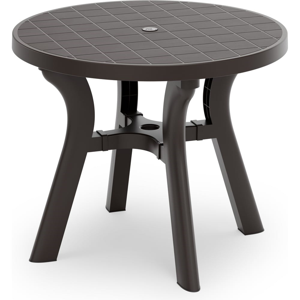 Стол "Атлант" с круглой столешницей имеет прочную конструкцию и устойчивый каркас, выдерживает воздействие внешних факторов, не теряя своего первоначального облика и качества. Изогнутые ножки соединены между собой крестовиной, что придает столу особую устойчивость. Ножки регулируются по высоте. Конструкция полностью разборная, что облегчает транспортировку и складирование. В центре столешницы имеется отверстие с заглушкой для установки зонта. Особенность данного стола в текстуре столешницы, которая имитирует дерево.