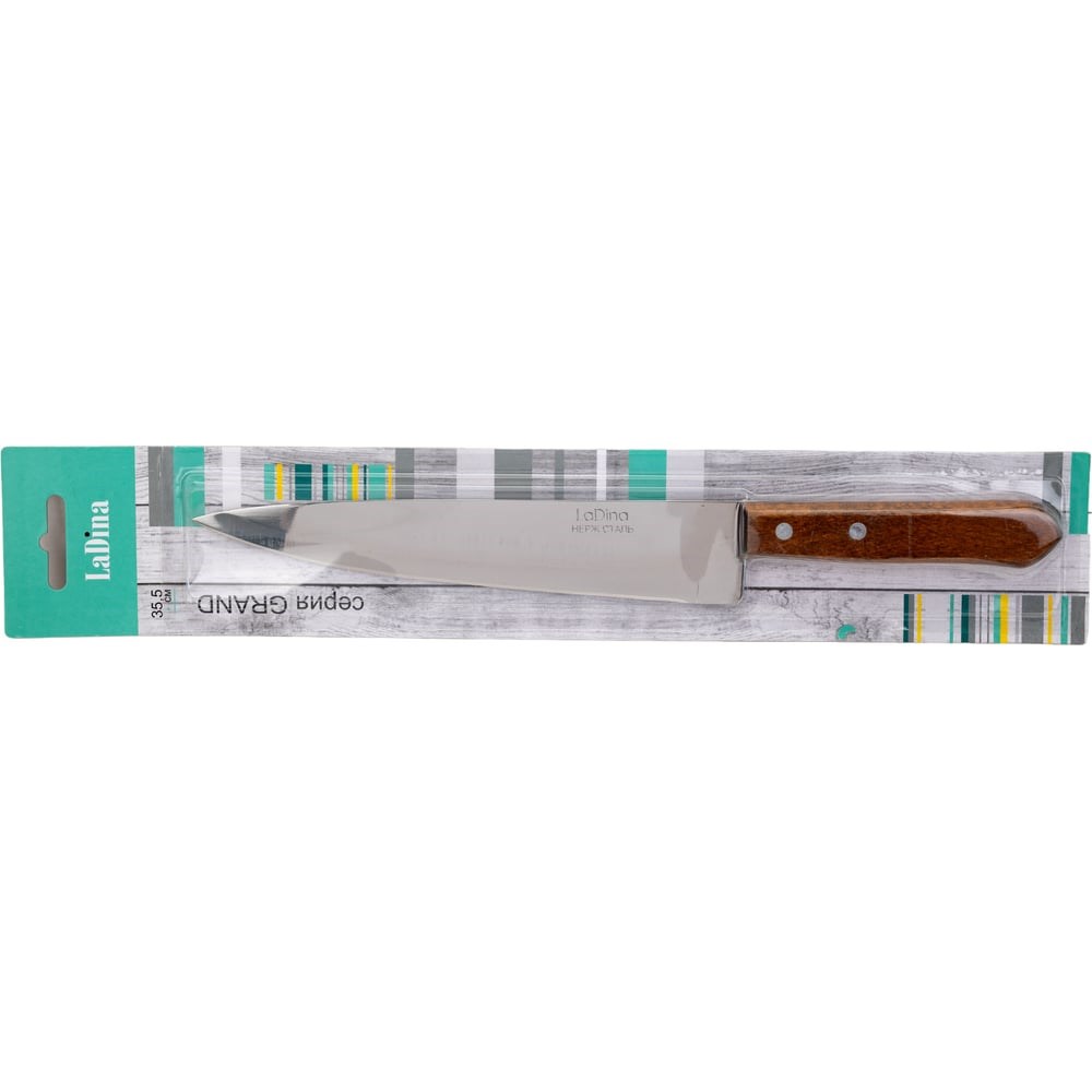 Кухонный нож Ladina GRAND деревянная ручка 35.5 см 20042 предназначен для бытового использования. Острое лезвие позволяет быстро нарезать продукты, что экономит время и силы. Благодаря эргономичной форме нож удобно лежит в руке. Изделие легко затачивается, поэтому отличается практичностью.