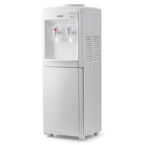 Напольный кулер для воды VATTEN V09WE с нагревом и электронной системой охлаждения. Цвет корпуса белый, все панели изготовлены из качественного, устойчивого к ультрафиолету пластика. Бак для горячей воды емкостью 1 литр с нагревательным элементом мощностью 650 Вт рассчитан на нагрев в течение одного часа до 6-ти литров. В течение часа успевает охлаждать не более 0,6 литров воды. В данном устройстве можно использовать бутыли на 18,9 или 11,3 литра. Данная модель имеет 2 удобных краника типа "нажим кружкой" для подачи горячей и охлажденной воды. В нижней части кулера имеется шкафчик объемом 9 литров, где удобно хранить продукты, которые всегда будут под рукой.