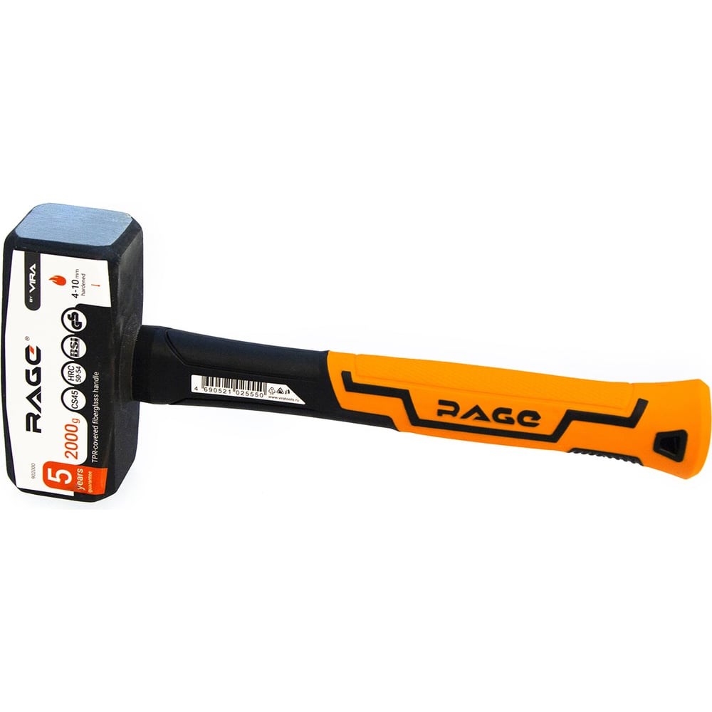 Кувалда RAGE by VIRA 2000г с фиберглассовой ручкой. Кувалду используют для забивания крупного крепежа, обработки металлов, при ковке, при разборке конструкций из металла, дерева и камня. Эта модель кувалды предназначена для хвата рукоятки обеими руками. Боёк выполнен из инструментальной стали CS45. Твердость бойка: 50-54 HRC. Ударная группа RAGE by VIRA соответствует немецкому стандарту DIN, кувалда имеет свою маркировку на бойке инструмента. Рабочая часть кувалды плотно соединена с рукояткой и ощущается как её продолжение. Эти части практически невозможно разделить. Наши специалисты поработали над усилением закалки инструмента с исходных 2-6 мм до 4-10 мм. Боёк меньше разрушается при ударах. Рукоятка из фибергласса прочна, но легка. При использовании многократной намотки, из этого сырья изготавливают парусные мачты, автомобильные глушители и велосипедные рамы. Фибергласс не рассыхается, не гниет, не реагирует на воздействие кислот. Ещё одно преимущество материала – его способность гасить передающиеся удары, а значит вы меньше отобьете руки, работая кувалдой. Покрытие из термопластичной резины TPR мягкое наощупь и не дает рукоятке скользить в ладони. Мы привели всю ударную группу компании RAGE by VIRA в соответствие с требованиями немецкого промышленного стандарта качества Geprüfte Sicherheit (GS). Кроме того, вся ударная группа соответствуют качеству британского института стандартов BSI.