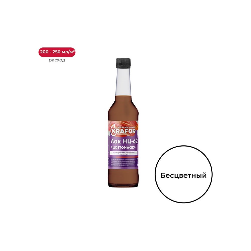 Применяется для декоративной окраски и защиты различных поверхностей. Состав: органические растворители, акриловый сополимер, синтетическая смола, сиккатив; Разбавление: ксилолом; Расход: 200 - 250 мл/м²; Время высыхания: 30 минут; Температура эксплуатации: от -30 до +100 °С; Степень блеска: глянцевая; Цвет: бесцветный; Объем: 0,5 л. Бесцветный Лак НЦ-62 Krafor защищает и декорирует изделия из черных и цветных металлов, кирпича, а также камня, керамики, дерева, стекла и других материалов, эксплуатирующихся при температуре от -30 до +100 °С. Нанесение на поверхности цветных металлов предотвращает их потускнение. При необходимости разбавлять ксилолом.