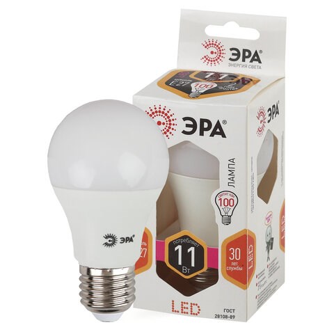 Лампа светодиодная ЭРА STD, 11 (100) Вт, цоколь E27, груша, теплый белый свет, 35000 ч., LED A60-11W-827-E27, Б0030910