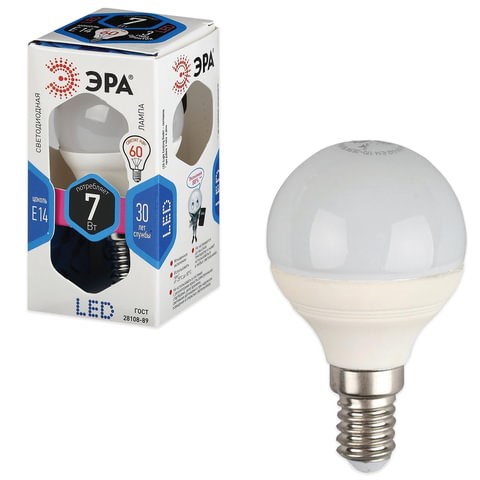 Лампа светодиодная ЭРА STD, 7 (60) Вт, цоколь E14, шар, нейтральный белый свет, 30000 ч., LED P45-7W-840-E14, Б0020551