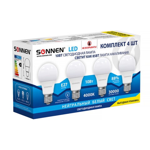 Лампа светодиодная SONNEN, 10 (85) Вт, КОМПЛЕКТ 4 шт., цоколь Е27, нейтральный белый, 30000 ч, 455938