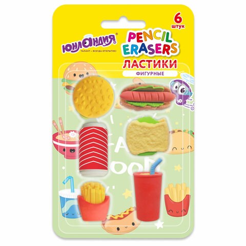 Ластики ЮНЛАНДИЯ "Фастфуд" выполнены в форме любимых многими лакомств: гамбургера, сэндвича, хотдога, картошки фри, банки с напитком и стакана с коктейлем. Яркие цвета и необычный дизайн не дадут им потеряться на рабочем столе или в пенале. Ластики обеспечат лёгкое и чистое стирание без повреждения поверхности бумаги и без образования бумажной пыли. Выполнены из безопасного нетоксичного материала - термопластичной резины. Упакованы в блистер по 6 штук в ассорти дизайнах. Яркие красочные ластики порадуют ребенка и станут отличным помощником в процессе рисования карандашом.