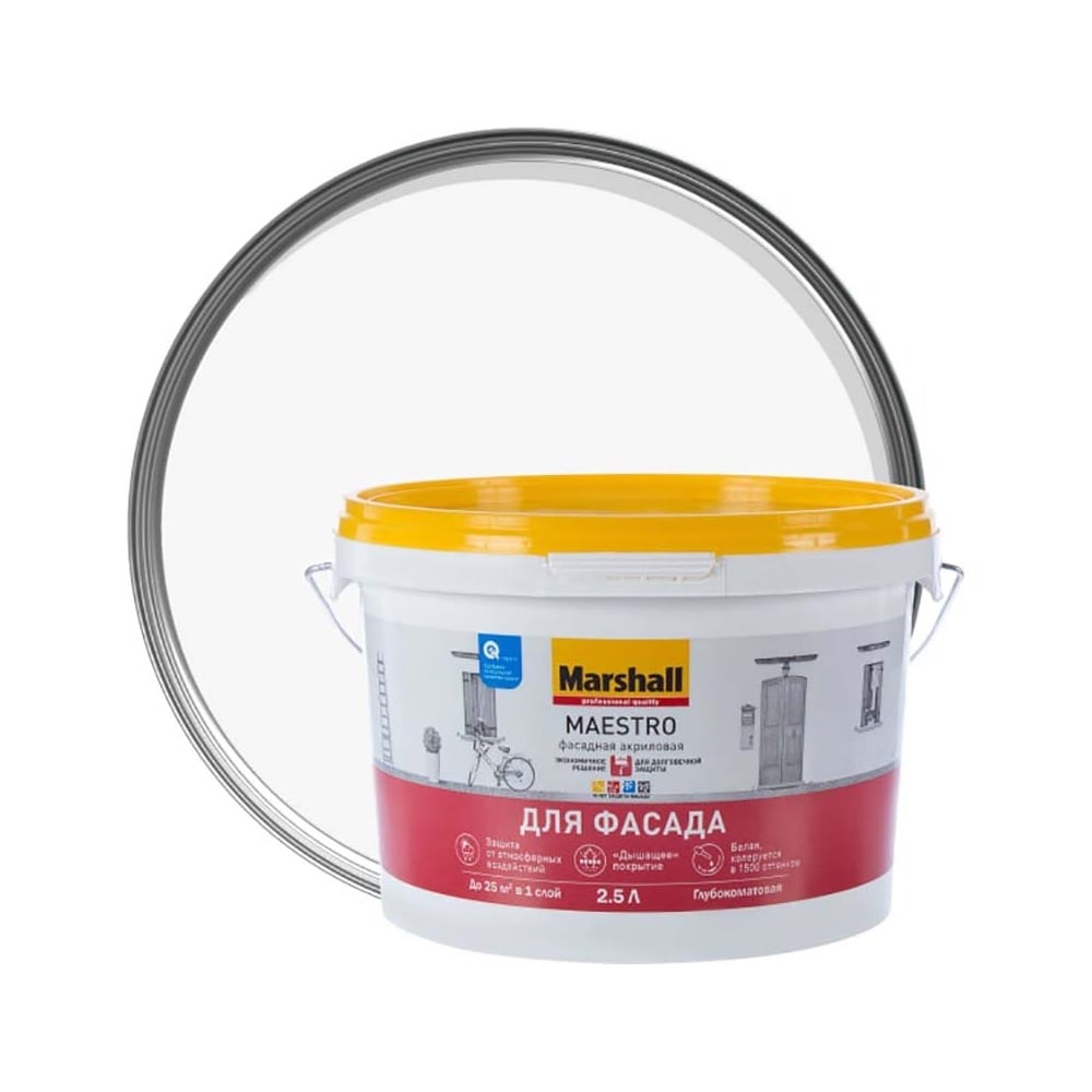 Латексная краска для наружных работ MARSHALL MAESTRO ДЛЯ ФАСАДА, матовая, база BW 2,5 л 5251963 обладает высокой укрывистостью, атмосферостойкостью, грязе- и водоотталкивающими свойствами. Срок службы финишного покрытия до 10 лет.Быстросохнущий состав легко наносится и равномерно распределяется, скрывая небольшие дефекты основания. Продукт широко используют для защитно-декоративного окрашивания сухих минеральных поверхностей: бетон, штукатурка, кирпич.Область примененияДля наружных работ. Подходит для нанесения на полностью просохшие минеральные поверхности (бетон, штукатурка, кирпич и т. п.). Рекомендуется для окраски фасадов жилых и общественных зданий, подземных гаражей, остекленных балконов, лоджий, тамбуров.Особенности примененияПеред применением разбавить в рекомендованной пропорции водой и тщательно перемешать. Произвести подготовку поверхности. Рекомендуется наносить в два слоя при температуре от +5°C до +30°С, относительной влажности воздуха <80%. Для укрепления базовой поверхности и повышения адгезии слабо связанные или пористые поверхности обработать грунтовкой глубокого проникновения Export Base.