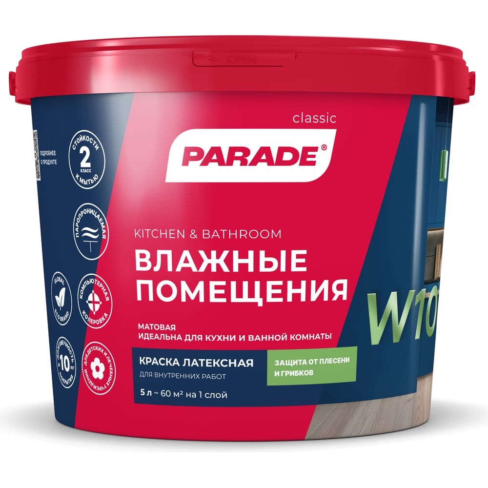 Краска латексная PARADE W100 Влажные помещения база А 5 л Россия 90002002359 - акриловая водно-дисперсионная белая матовая краска. Образует прочное матовое влагостойкое паропроницаемое покрытие, выдерживающее частую влажную уборку. Обладает высокими декоративными свойствами, отличной укрывистостью и прочным сцеплением с основанием.