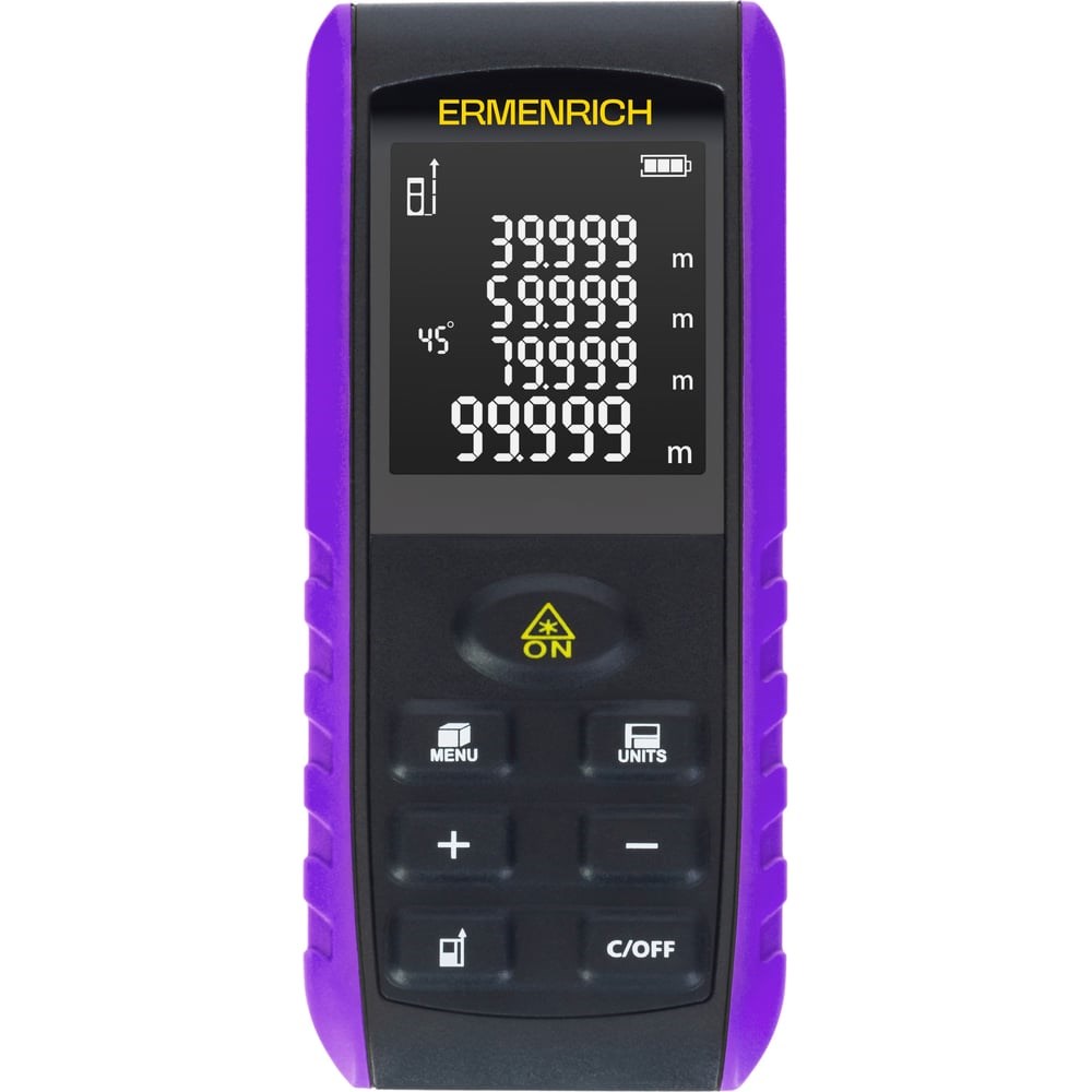 Рулетка Ermenrich Reel PRO GE80 с помощью лазерного луча измеряет не только расстояния, но и площадь объекта, объем и углы. Эти функции будут полезны в строительных работах, при ремонте, монтаже мебели или оборудования и других профессиональных и домашних работах. Объект можно измерять однократно или в режиме сканирования. При сложной форме объекта можно провести несколько измерений, а функция «Пифагор» позволит автоматически просуммировать результат. Диапазон измерений – 0,05–80 м Доступны измерения в метрах, футах или дюймах. Результаты измерений сохраняются в памяти: 99 слотов позволяют сохранять до 99 групп измерений. Работу обеспечивают 2 мизинчиковые батарейки. Режим автоотключения последовательно выключает лазерный луч и затем само устройство, что позволяет сохранить заряд. Общее число измерений от одного комплекта батареек превышает 5000. Рулетка производит безопасный лазерный луч. Она работает в температурах от 0 до +40 °С. Сам прибор сделан из пластика, для управления есть 7 кнопок на корпусе. Показания отображаются на монохромном контрастном экране, для вывода результатов доступны 4 строки.