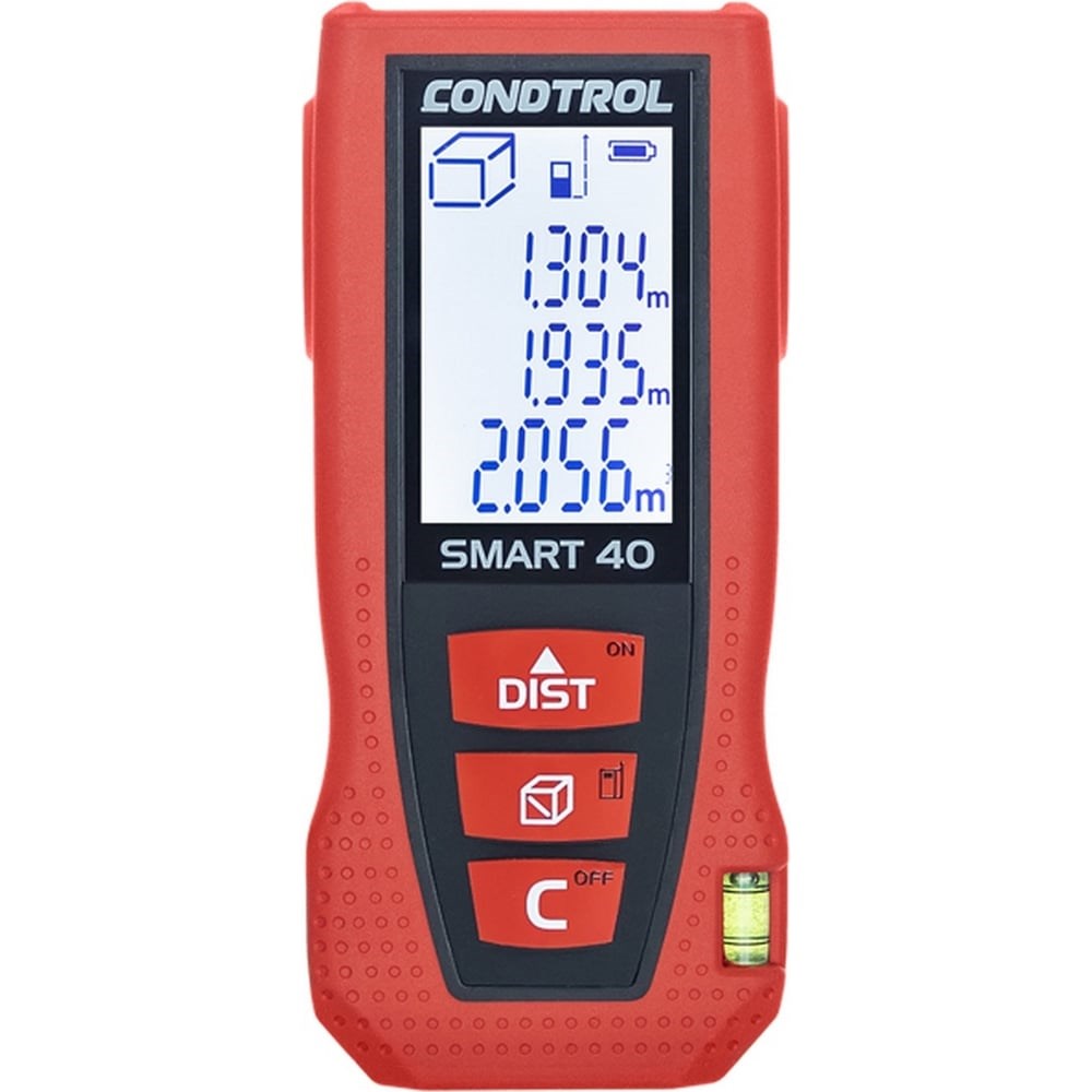Лазерный дальномер CONDTROL Smart 40 1-4-097 предназначен для измерения длины, расчета площади и объема, вычисления по теореме Пифагора. Он подходит для работы как внутри, так и снаружи помещений на расстоянии до 40 метров. Прибор отличается ударопрочным корпусом, а также простым управлением с помощью всего лишь трех кнопок. Прибор имеет черно-белый дисплей, что позволяет легко считывать данные даже на ярком солнце.
