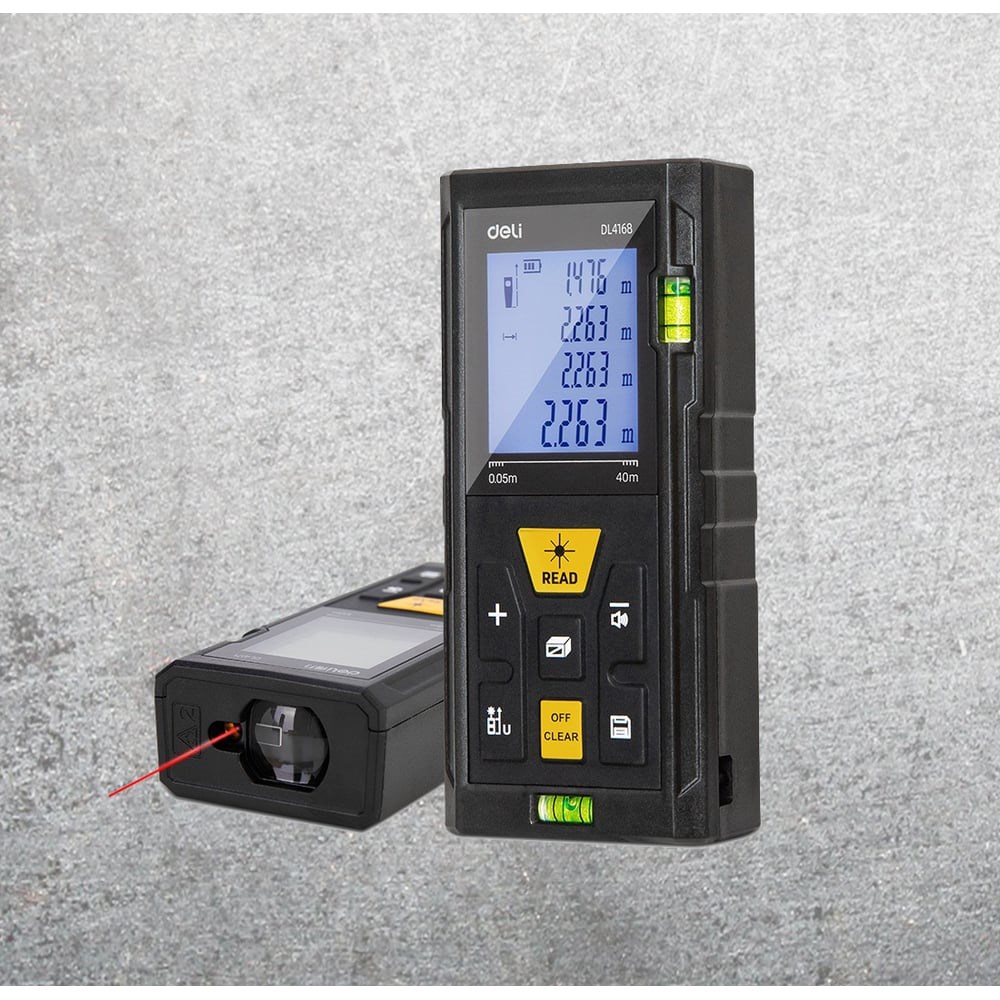 Лазерный дальномер Дели DL4168 высокоточный инструмент, который используется в процессе строительства и ремонта для измерения расстояний от 0.05 м до 40 м. Большой четырехстрочный дисплей диагональю 1,7 дюймов способен отображать не только текущее измерение, но и режим измерений, предыдущие измеренные значения, и многие другие показатели, например, индикацию заряда батареи. Экран прибора оснащен яркой подсветкой для комфортной работы при недостаточном освещении. Встроенная память позволяет вам хранить до 30 измеренных значений. Дальномер оснащен лазером, который позволяет измерять расстояния на удалении до 40 метров с трехмиллиметровой точностью Функция периметра, площади и объема - позволяет автоматически рассчитать эти значения Функция Пифагора - поможет вам измерить недоступные расстояния или вычислять высоту объекта Функция непрерывных измерений - Вы можете двигаться с включенным дальномером, удаляясь или приближаясь к объекту измерений, а на экране при этом будет в реальном времени отображаться текущее расстояние Функция определения минимума и максимума - перемещайте лазерный луч в пространстве, а лазерная рулетка автоматически запомнит максимальное или минимальное измеренное значение Функция сложения и вычитания Через 30 секунд бездействия прибор отключает подсветку дисплея, а через 180 секунд автоматически выключается.