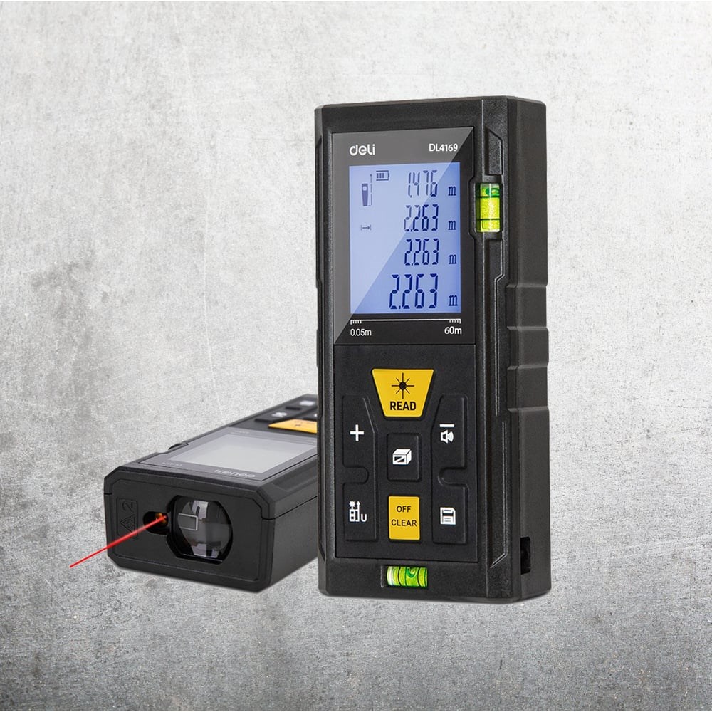 Лазерный дальномер Дели DL4169 - высокоточный инструмент, который используется в процессе строительства и ремонта для измерения расстояний от 0,05м до 60м. Большой четырехстрочный дисплей диагональю 1,7 дюймов способен отображать не только текущее измерение, но и режим измерений, предыдущие измеренные значения и многие другие показатели, облегчающие использование прибора (например, индикацию заряда батареи). Экран прибора оснащен яркой подсветкой для работы при недостаточном освещении. Встроенная память позволяет вам хранить до 30 измеренных значений. Дальномер оснащен лазером, который позволяет измерять расстояния на удалении до 60 метров с трехмиллиметровой точностью. Функция периметра, площади и объема позволяет автоматически рассчитать эти значения. Функция Пифагора поможет вам измерить недоступные расстояния или вычислять высоту объекта, автоматически используя знаменитую теорему. Функция непрерывных измерений. Функция определения минимума и максимума. Перемещайте лазерный луч в пространстве, а лазерная рулетка автоматически запомнит максимальное или минимальное измеренное значение и выведет его на экран. Это очень удобно, если вам, например, понадобилось измерить диагональ комнаты или определить расстояние до нескольких объектов, расположенных друг за другом. Функция сложения и вычитания избавит вас от необходимости носить с собой калькулятор или выполнять подсчеты в уме. Через 30 секунд бездействия прибор отключает подсветку дисплея, а через 180 секунд автоматически выключается.
