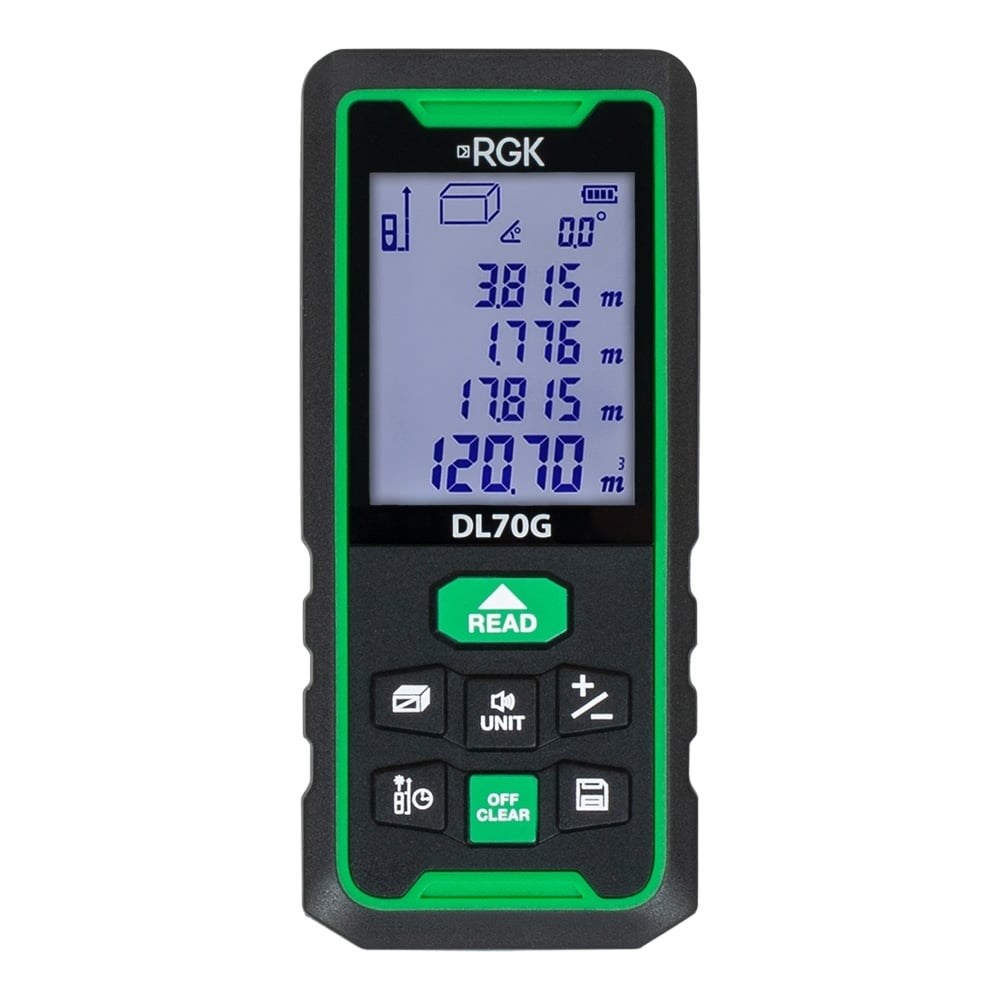 Лазерный дальномер с угломером RGK DL70G 778183 предназначен для измерения расстояния до 70 метров. Для лучшей видимости предусмотрена подсветка дисплея. Поддерживает большое количество функций, среди которых измерение объема, площади и углов, сложение/вычитание длины, площади и объема, измерения по Пифагору и др. Данная модель имеет память на 30 значений, поэтому бумажные записи вам больше не нужны.