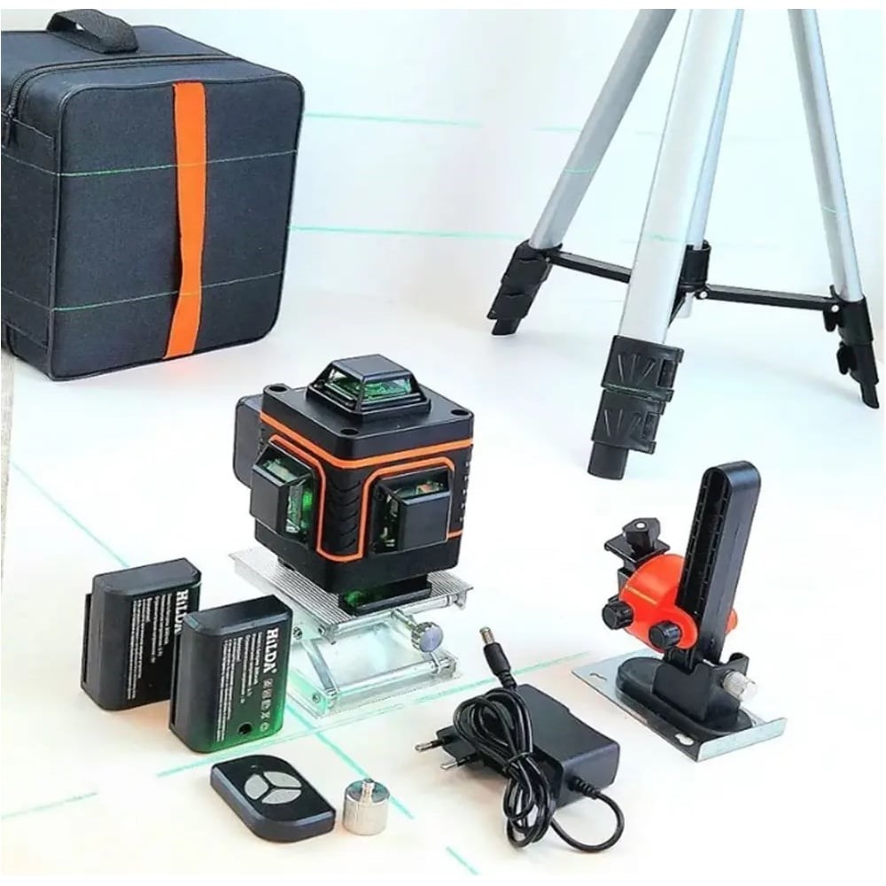 Предлагаем Вашему вниманию одну из самых популярных моделей бренда Hilda. У данного осепостроителя 4 излучателя проектирующее яркие лучи зеленого цвета вкруговую. Две горизонтальные проекции - вверху уровня (1 см от потолка) и внизу (в 1см от пола). Нижний горизонт очень удобен для работ с полом. Стяжка, плитка, двери, мебель и т.д. Если включить нивелир в комнате, то линии будут светить в 1 см от пола по всему периметру помещения. Еще один горизонт сверху уровня для работ с потолком и на стенах. Его минимальный отпуск от потолка тоже 1см. По бокам уровня две вертикальные проекции, пересекающиеся между собой под прямым углом.