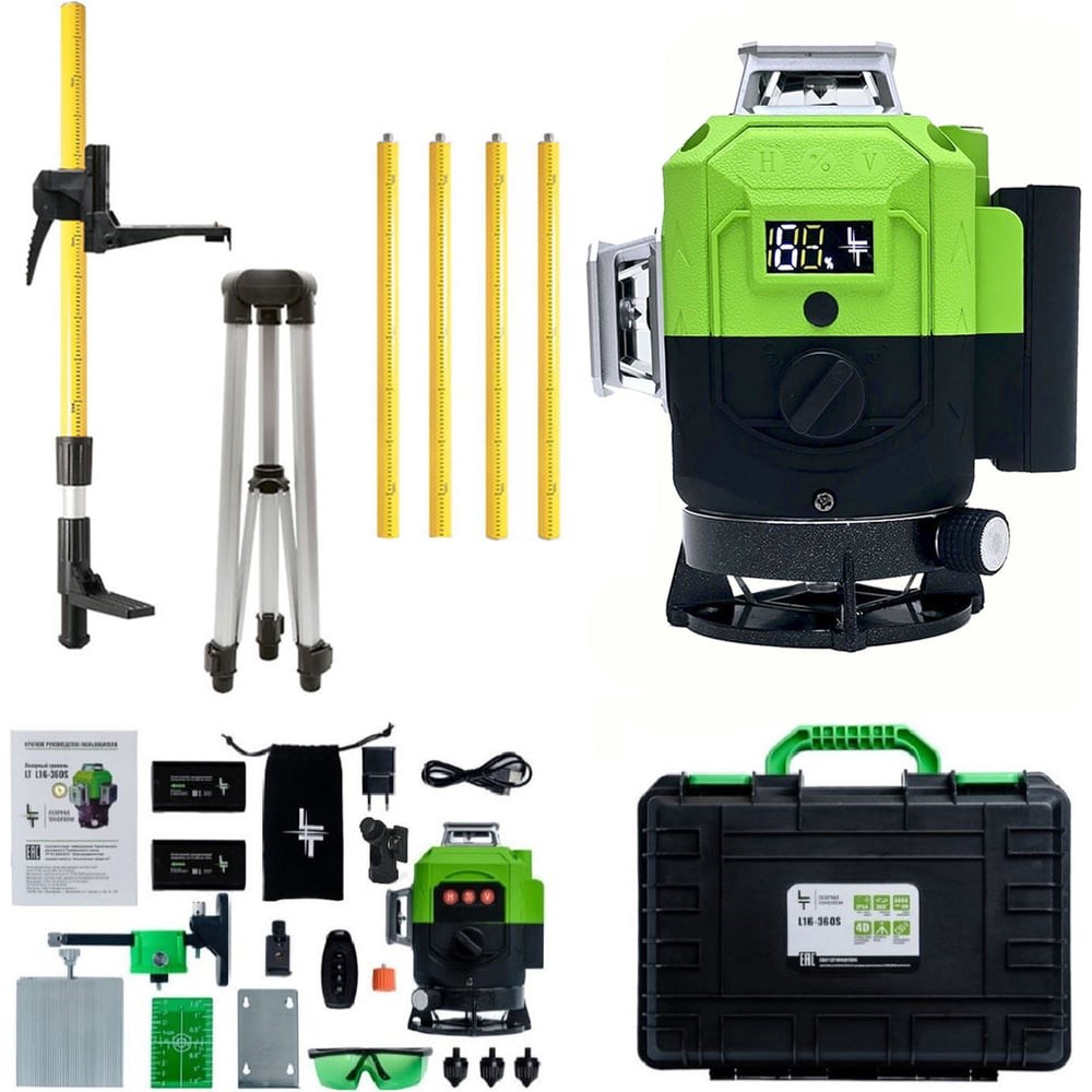 Профессиональный лазерный уровень LT + штатив с треногой L16-360S/3.6м+ выстраивает 4 плоскости в 360 градусов: 2 вертикальные плоскости с пересечением под прямым углом и 2 горизонтальные линии снизу и сверху уровня. Работает от Li-ion батареи 6000 Мач. Особенности: до 8 часов работы при постоянном свечение луча лучи включаются как с сенсорных кнопок на корпусе устройства, так и с пульта дистанционного управления зеленый цвет луча лучше виден на свету и менее вреден для глаз противоударный и влагозащитный кейс для переноски устройства Все уровни проходят трехступенчатый контроль проверки качества сборки на заводе-производителе и инспекционный контроль приемки товара. Дополнительно, каждое устройство самостоятельно проверяется перед отправкой покупателям. ВНИМАНИЕ!!! Цвет аксессуаров может отличаться от фото!