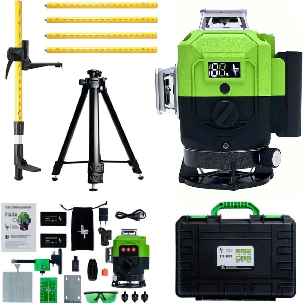 Профессиональный лазерный уровень LT L16-360S + штатив 3.6м + тренога 1.5м усиленная L16-360S/3.6м/1.5м-УС выстраивает 4 плоскости в 360 градусов (в круговую): 2 вертикальные плоскости 360 градусов с пересечением под прямым углом 90 градусов, 2 горизонтальные линии 360 градусов снизу и сверху уровня. Нижний горизонт идеально подходит для работ по заливки полов и стяжки. Работает от Li-ion батареи 6000 Мач (в комплекте идут две батареи) с зарядным устройством. Зарядное устройство USB. Особенности: до 8 часов работы при постоянном свечение луча лучи включаются как с сенсорных кнопок на корпусе устройства, так и с пульта дистанционного управления при помощи приемника (отражателя) лазерных лучей (приобретается отдельно) можно работать в солнечную погоду противоударный и влагозащитный кейс для переноски устройства Все уровни проходят трехступенчатый контроль проверки качества сборки на заводе-производителе и инспекционный контроль приемки товара. Калибровка устройств производится на заводе с помощью специального оборудования, сертифицированного по международным стандартам и только специалистами самого высокого уровня допуска.