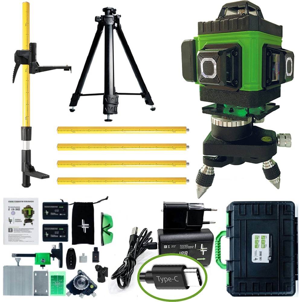 Профессиональный лазерный уровень LT L16-360Z + штатив 3.6м + тренога 1.5м усиленная L16-360Z/3.6м/1.5м-УС выстраивает 4 плоскости в 360 градусов (в круговую): 2 вертикальные плоскости 360 градусов с пересечением под прямым углом 90 градусов, 2 горизонтальные линии 360 градусов снизу и сверху уровня. Нижний горизонт идеально подходит для работ по заливки полов и стяжки. Работает от Li-ion батареи 6000 Мач (в комплекте идут две батареи) с зарядным устройством. Устройства можно заряжать во время эксплуатации как от блока питания, так и от power bank. Особенности: до 8 часов работы при постоянном свечение луча лучи включаются как с сенсорных кнопок на корпусе устройства, так и с пульта дистанционного управления при помощи приемника (отражателя) лазерных лучей (приобретается отдельно) можно работать в солнечную погоду противоударный и влагозащитный кейс для переноски устройства Все уровни проходят трехступенчатый контроль проверки качества сборки на заводе-производителе и инспекционный контроль приемки товара. Калибровка устройств производится на заводе с помощью специального оборудования, сертифицированного по международным стандартам и только специалистами самого высокого уровня допуска. ВНИМАНИЕ! Цвет аксессуаров может отличаться от фото!