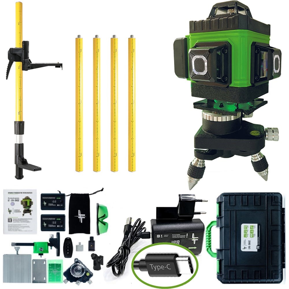 Профессиональный лазерный уровень LT L16-360Z + штатив 3.6 м L16-360Z/3.6м выстраивает 4 плоскости в 360 градусов (в круговую): 2 вертикальные плоскости с пересечением под прямым углом и 2 горизонтальные линии снизу и сверху уровня. Работает от Li-ion батареи 6000 Мач. Особенности: до 8 часов работы при постоянном свечение луча лучи включаются как с сенсорных кнопок на корпусе устройства, так и с пульта дистанционного управления зеленый цвет луча лучше виден на свету и менее вреден для глаз противоударный и влагозащитный кейс для переноски устройства Уровень проходит трехступенчатый контроль проверки качества сборки на заводе-производителе и инспекционный контроль приемки товара. ВНИМАНИЕ!!! Цвет аксессуаров может отличаться от фото!