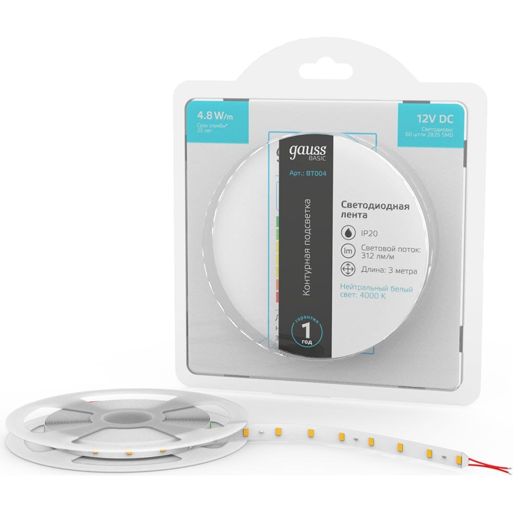 Лента GAUSS Basic 12V 4,8W/m 312lm/m 4000K IP20 LED 3m BT004 способна решить ряд задач связанных как с декоративным освещением помещений, так и с экстерьерной подсветкой. Основой для ленты служит первичный силикон, без дополнительных примесей, что существенно увеличивает срок службы и помогает сохранить первоначальный вид на протяжении всего срока эксплуатации. Вариативный диапазон размещения количества светодиодов на метр позволяет использовать ленту для акцентной подсветки и для основного освещения. Высокий коэффициент CRI (> 80 ) обеспечит естественную цветопередачу.