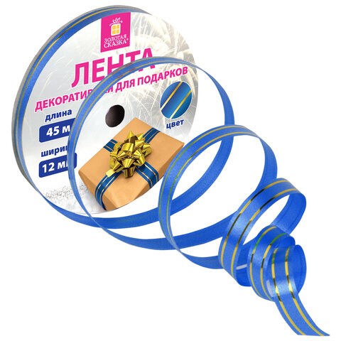 Лента упаковочная декоративная для подарков, золотые полосы, 12 мм х 45 м, синяя, ЗОЛОТАЯ СКАЗКА, 591822