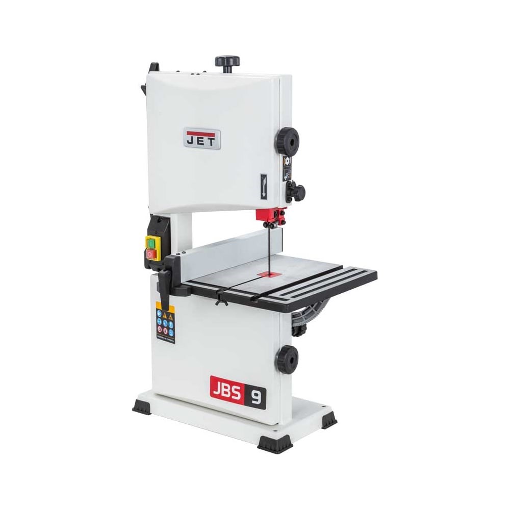JWBS-9SL – настольный ленточнопильный станок для частного любительского применения. Позволяет распускать заготовки толщиной до 90 и шириной до 225 мм. Укомплектован трехроликовыми направляющими с шарикоподшипниками, обеспечивающими легкое движение ленты, минимальный износ и простоту регулировки. Ведущий шкив приводится во вращение через зубчато-ременную передачу, а не установлен непосредственно на валу двигателя, как часто делают для упрощения конструкции. Такая разнесенная схема дает более плавное без биений вращение и лучшую ремонтопригодность. Важное достоинство JWBS-9SL – рычаг для быстрого натяжения и ослабления ленты, позволяющий оперативно переходить от состояния хранения к рабочему и обратно. Механизм имеет большой рабочий диапазон и нечувствителен даже к значительным неточностям длины полотна: инструкция допускает отклонения +/- 3 мм от штатных 1575 мм, но это значение указано «с запасом». Рабочий стол, выполненный из алюминиевого литья, регулируется по наклону. В его поверхности предусмотрен П-образный паз для вспомогательных приспособлений, например, для скользящего углового упора (входит в комплект поставки). Вдоль края перемещается параллельный упор с удобным эксцентриковым зажимом.Станок имеет современный эргономичный дизайн, у него крупные ухватистые рукоятки регулировок, фиксаторов и запоров. Предусмотрен патрубок для подключения к системе аспирации, удаляющий опилки из нижней части корпуса.