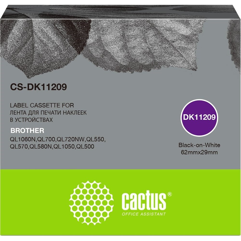 Ленточный картридж Cactus dk-11209 черный, для brother p-touch ql-500, ql-550, ql-700, ql-800 CS-DK11209 для печати адресных наклеек 29х62 мм, в рулоне 800 шт. Бумажные наклейки подходят для маркировки различных изделий и упаковки. С их помощью можно создавать этикетки с логотипом, штрих-кодом, бейджи для посетителей или почтовые наклейки для доставки. Широкая сфера применения: дома, в офисе, на производстве. Совместим с принтерами: Brother P-touch QL-500, QL-550, QL-700, QL-800. Ширина этикетки 29 мм Длина этикетки 62 мм