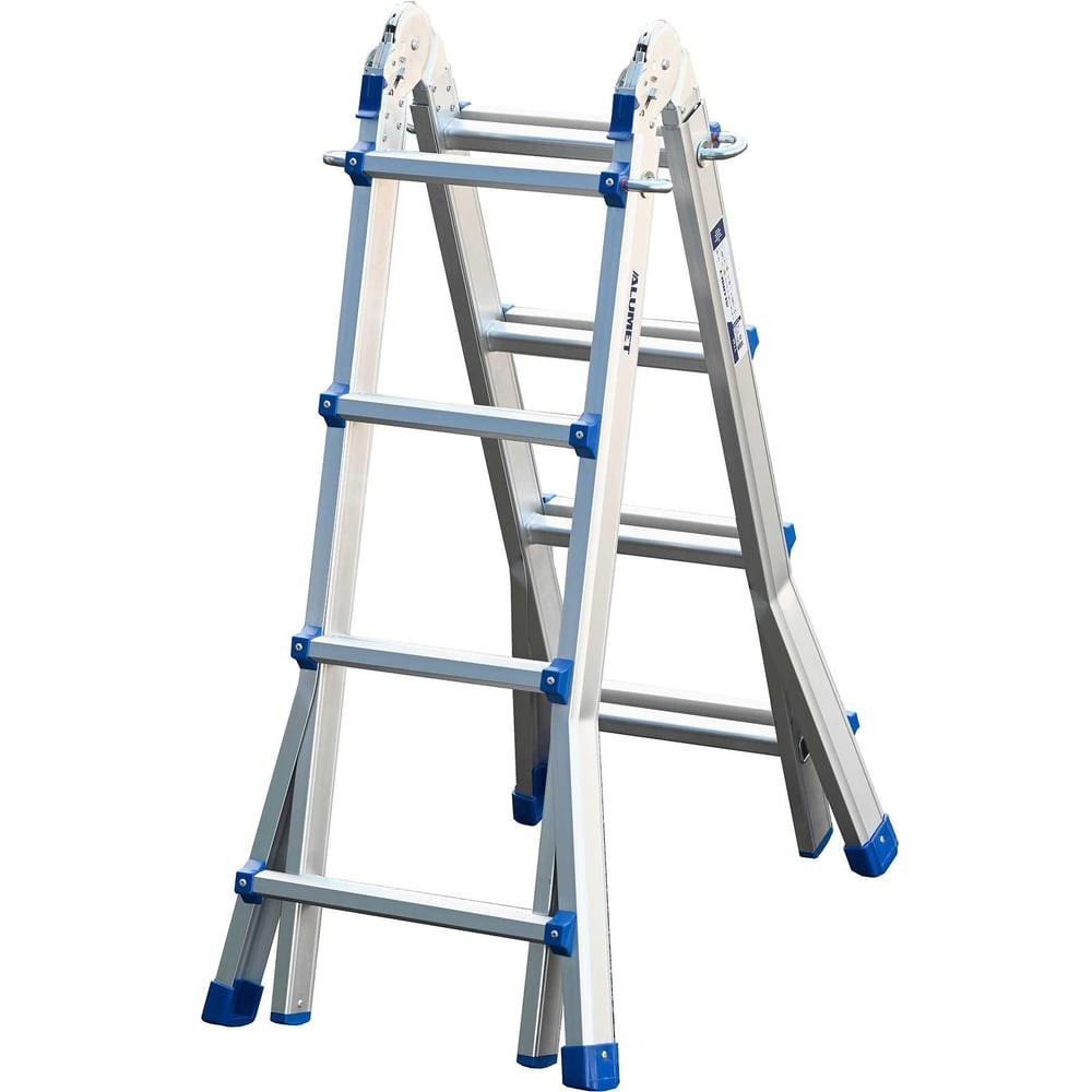 Лестница алюминиевая шарнирная телескопическая– представляет собой лестницу-трансформер, состоящую из двух основных и двух дополнительных секций, соединенных между собой стальными шарнирами. Дополнительные секции фиксируются к основным при помощи фиксатора, вставленного в ступень.Шарнины выполнены оцинкованной стали. Профиль лестницы изготовлен из высокопрочного алюминиевого сплава (ГОСТ 22233), обеспечивающего изделию прочность и легкость, что важно для транспортировки и установки. Профиль доп.секции - П-образный .Ступени выполнены с рифлением,что способствует безопасному подъёму и спуску.Особенности: лестница может использоваться в положениях: -приставная, - стремянка, -маршевая лестница.Идеальный помощник в офисе, на производстве, в быту, на даче.Лестницу можно использовать вне помещения. Конструкция стойкая к воздействию неблагоприятных погодных условий благодаря коррозионностойким свойствам алюминия. Этот фактор является одним из главных преимуществ модели.Завод – изготовитель оставляет за собой право в одностороннем порядке вносить изменения в конструкцию, в целях улучшения технических характеристик.на линейные размеры отклонение может составлять +-5 мм, на вес изделия +-5%*кол-во ступеней на фото может не совпадать с описанием.