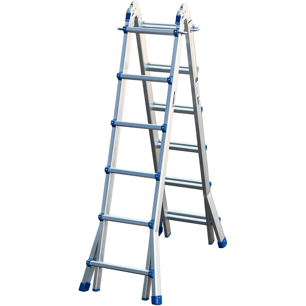 Лестница алюминиевая шарнирная телескопическая– представляет собой лестницу-трансформер, состоящую из двух основных и двух дополнительных секций, соединенных между собой стальными шарнирами. Дополнительные секции фиксируются к основным при помощи фиксатора, вставленного в ступень. Шарнины выполнены оцинкованной стали. Профиль лестницы изготовлен из высокопрочного алюминиевого сплава (ГОСТ 22233), обеспечивающего изделию прочность и легкость, что важно для транспортировки и установки. Профиль доп.секции - П-образный .Ступени выполнены с рифлением,что способствует безопасному подъёму и спуску.Особенности: лестница может использоваться в положениях: -приставная, - стремянка, -маршевая лестница.Идеальный помощник в офисе, на производстве, в быту, на даче.Лестницу можно использовать вне помещения. Конструкция стойкая к воздействию неблагоприятных погодных условий благодаря коррозионностойким свойствам алюминия. Этот фактор является одним из главных преимуществ модели.Завод – изготовитель оставляет за собой право в одностороннем порядке вносить изменения в конструкцию, в целях улучшения технических характеристик.на линейные размеры отклонение может составлять +-5 мм, на вес изделия +-5%*кол-во ступеней на фото может не совпадать с описанием.