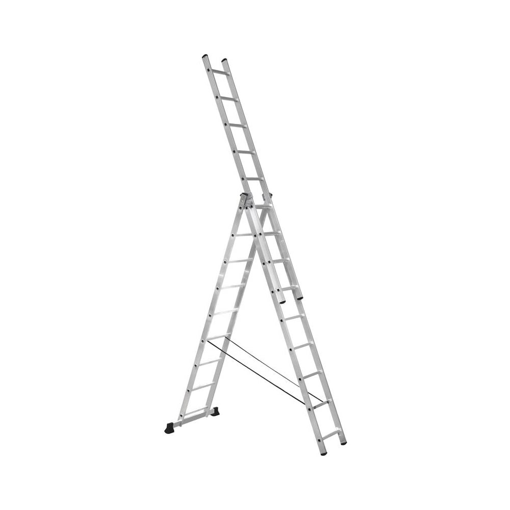 Универсальность данной лестницы заключается в том, что она может использоваться как раздвижная приставная лестница из трех частей и как свободностоящая стремянка (перевернутая русская буква 'У'). Более того третья секция является съемной, и ею можно пользоваться отдельно как приставной лестницей, а оставшаяся часть при этом представляет двухсекционную универсальную лестницу. Необходимый для прочности перехлест второй и третьей секции обеспечивается боковым упором. Вставить третью секцию сверху через верхний соединительный узел и обойти этот упор невозможно. Устойчивость. Лестница оснащена поперечной траверсой и специальными опорные заглушками с протектором, исключающими скольжение. Прочность. Качественный профиль позволяет ей выдерживать нагрузку до 150 кг.