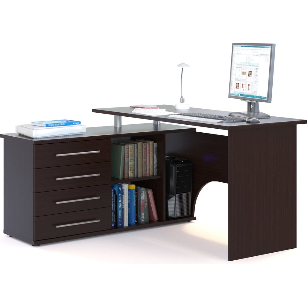 Угловой компьютерный стол СОКОЛ Стол компьютерный Левый Венге КСТ-109Л КСТ109ЛВ5 с двумя рабочими поверхностями для организации рабочей зоны дома и в офисе. Основная столешница имеет ширину 1400 мм, позволяя разместить компьютер и рабочие материалы. На малой столешнице — 1200 мм, удобно держать под рукой книги, папки, канцелярию.Преимущества:функциональный — две рабочие поверхности, удобно держать все необходимое под рукой;вместительный — оборудован тумбой с 4 ящиками, 2 просторными полками и нишей под системный блок;угловая конструкция — экономит пространство, есть возможность выбора нужной ориентации стола (левый или правый угол);подходит для зонирования — задняя стенка выполнена из ЛДСП в цвете корпуса, можно ставить не у стены.Стол оборудован тумбой с четырьмя ящиками на роликовых направляющих, открытыми полками и нишей под системный блок. Такая модель компьютерного стола позволяет организовать функциональную рабочую зону как в домашнем кабинете, так и в офисе.Габариты ящиков (ВхШхГ): 444 х 334 х 81 мм. Размер ниши под системный блок (ВхШхГ) — 565 х 221 х 400 мм.Обратите внимание! Стол может быть с правым или левым углом (определяется по расположению тумбы). При оформлении заказа нужно выбрать необходимую ориентацию.