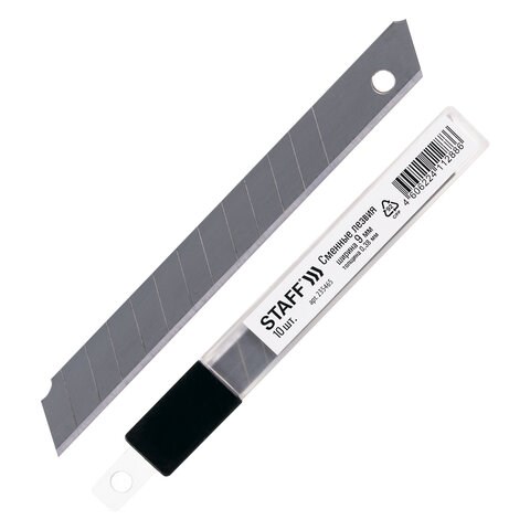 Лезвия для ножей 9 мм КОМПЛЕКТ 10 ШТ., толщина лезвия 0,38 мм, в пластиковом пенале, STAFF "Basic", 235465