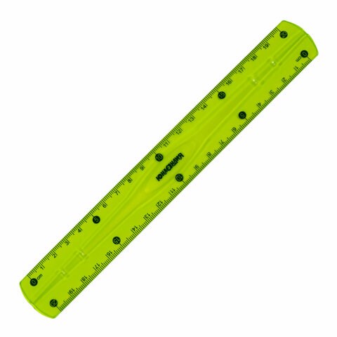 Изготовлена из гибкого прозрачного тонированного пластика зеленого цвета. Линейка имеет двустороннюю сантиметровую шкалу и четкую разметку, что делает ее удобной в использовании. Длина шкалы составляет 20 см. Упакована в пластиковый пакет с европодвесом.