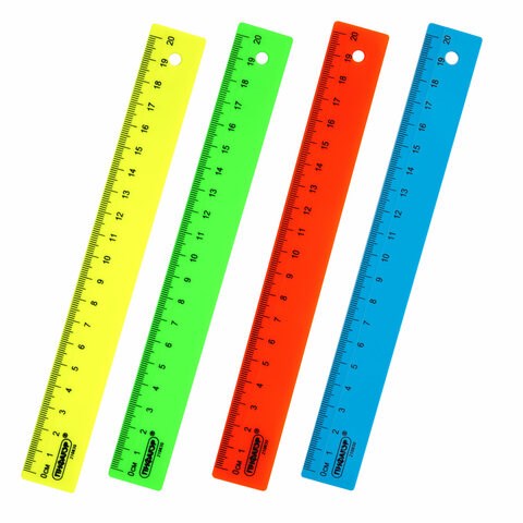 Изготовлена из прочного пластика ярких неоновых цветов. Имеет безопасные закруглённые углы. Чёткая разметка делает линейку удобной в использовании. Длина шкалы составляет 20 см. Поставляется в нескольких вариантах цвета (без возможности выбора).