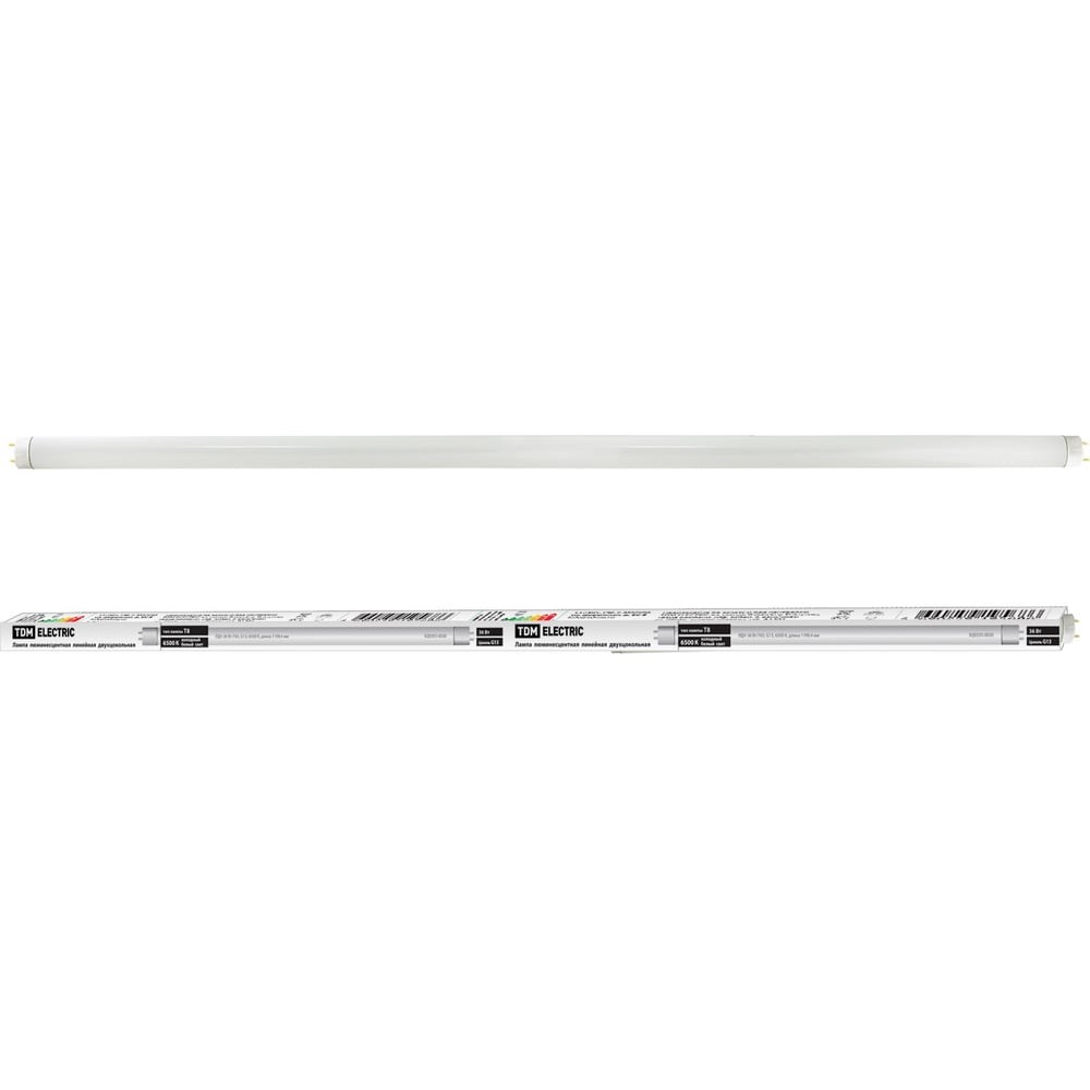 Люминесцентная линейная двухцокольная лампа TDM ELECTRIC ЛДХ-36Вт/765 T8/G13 6500 К SQ0355-0030 применяется для создания общего освещения в больших производственных или административных помещениях. Устройство представляет собой линейную колбу с матовым покрытием и двумя цоколями G13 по краям. Цветность - холодная. Лампа излучает дневной свет мощностью 36 Вт. Для подключения к сети необходима соответствующая ПРА.