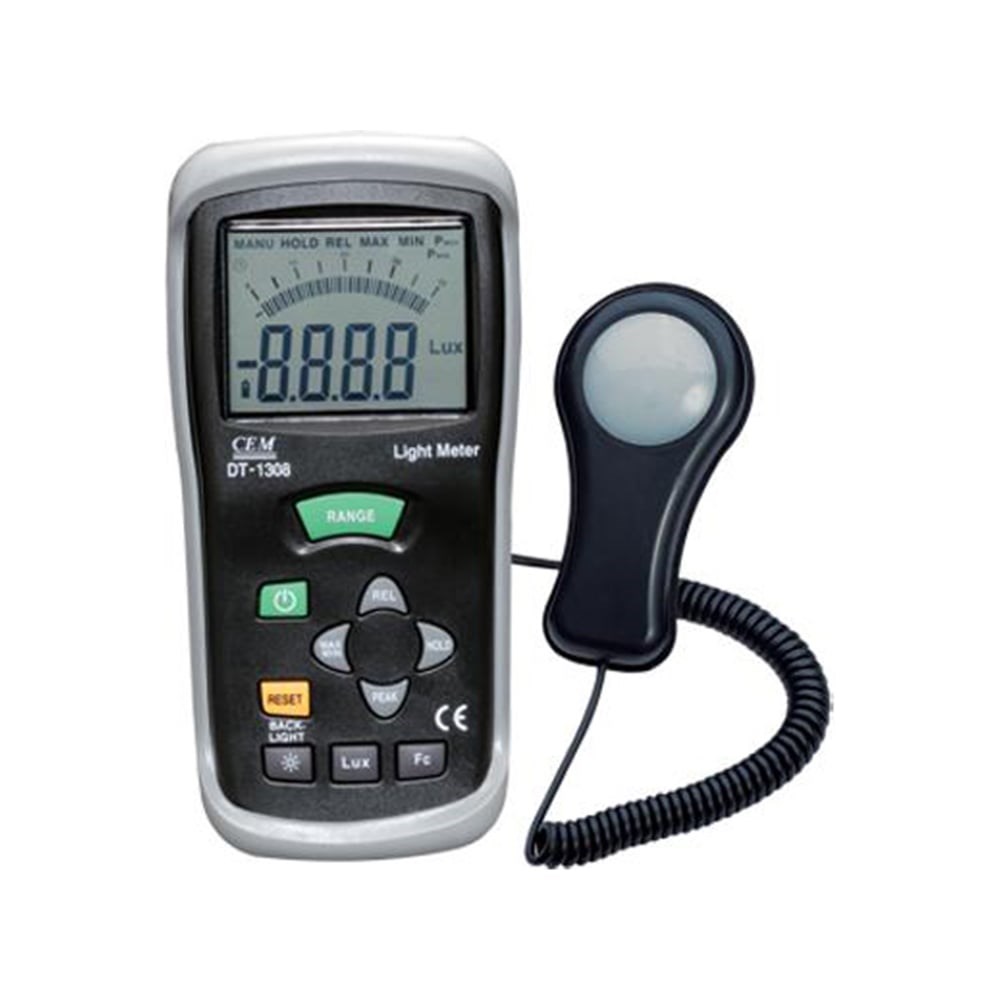 Измеритель уровня освещения (люксметр) СЕМ DT-1308 480243 отличается продолжительным сроком службы благодаря качественному светодиоду из кремния с коррегирующим фильтром. Прибор измеряет освещенность как в люксах, так и в фут-кандела. Конструкция модели позволяет получать точные данные независимо от угла падения света на фотодиод. Установка нуля осуществляется автоматически. Погрешность измерителя составляет ±5.0% (10000 Lux).