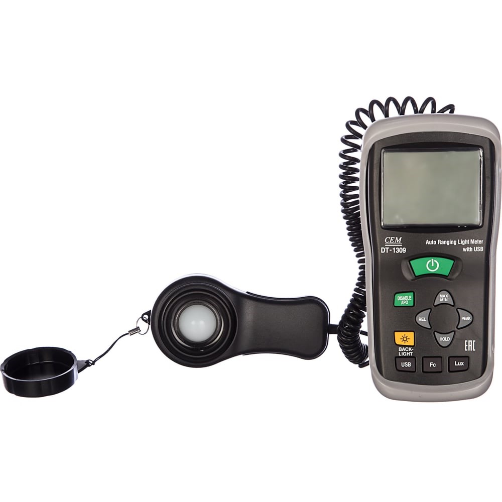 Измеритель уровня освещения (люксметр) СЕМ DT-1309 481646 подключается к ПК через USB порт для детального формирования отчета. В случае 20-минутного бездействия оператора модель самостоятельно отключается для экономии заряда батареи. При перегрузке на дисплее прибора отображается знак OL. В качестве фотодатчика используется кремниевый фотодиод. Коррегирующий фильтр гарантирует его стабильную работу. Шнур фотодатчика длиной 150 см позволяет измерять уровень освещенности на расстоянии от прибора. Масса инструмента составляет 390 граммов.
